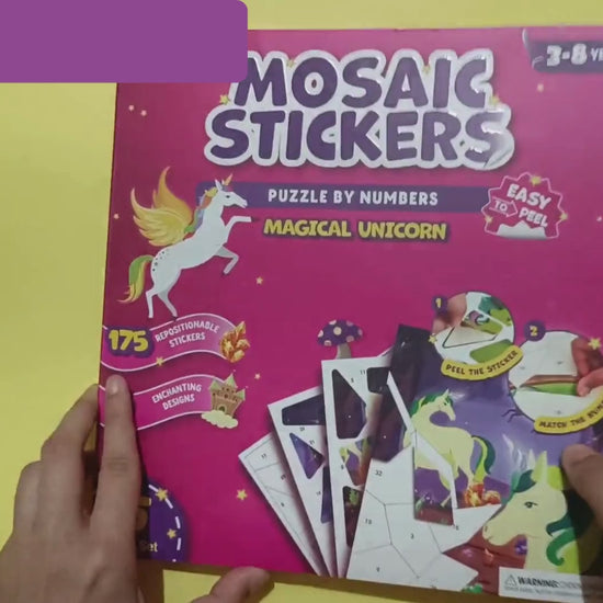 Each kit includes 5 vibrant design cards and 175+ peel-and-stick mosaic stickers, giving children a fun and engaging way to build their own artwork by matching stickers to numbered spaces — like a sticker puzzle meets paint-by-numbers.