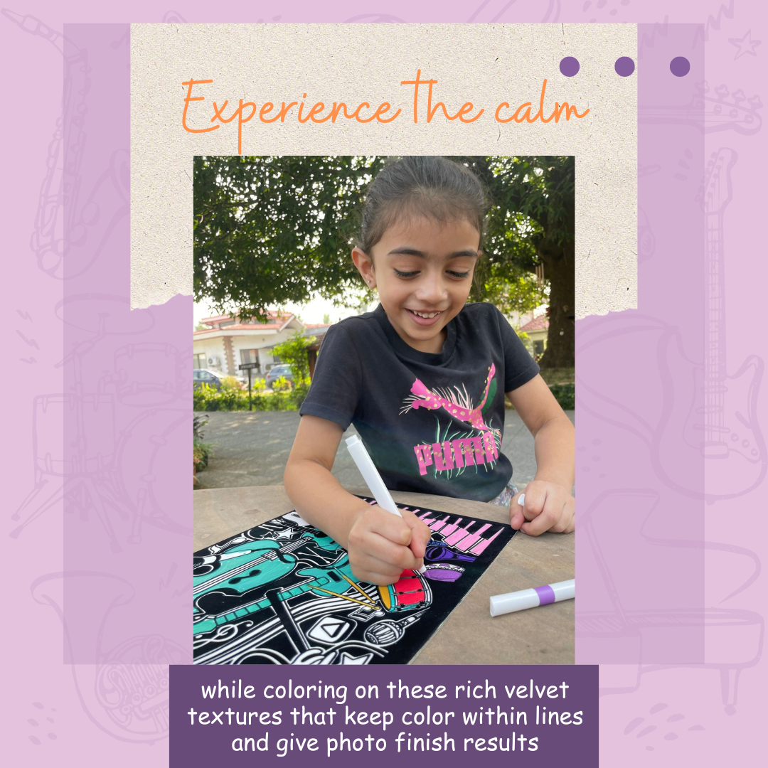 Musical-Themed Illustrations: Featuring a symphonic adventure with our musical instrument collage-themed Velvet Coloring Canvas.